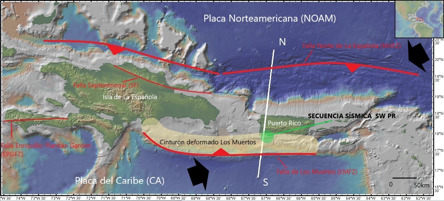 A partir de las primeras horas del 25 de diciembre pasado, la frecuencia en la sismicidad al norte del Canal de La Mona empezó a menguar y al mismo tiempo se inició una secuencia sísmica en el suroeste de Puerto Rico (sur de Guánica, Mar Caribe) con temblores de magnitudes poco comunes en esa región (> 3.0) hasta alcanzar 5.8 en enero 6 donde las alarmas se dispararon al presentarse serios daños en diferentes edificaciones en las poblaciones cercanas al epicentro. Al día siguiente, ocurrió el evento mayor (hasta el momento) o “Main Shock” de magnitud 6.4 que ocasionó también grandes daños físicos y una pérdida humana. Al día de hoy, más de 20,000 réplicas siguen ocurriendo.